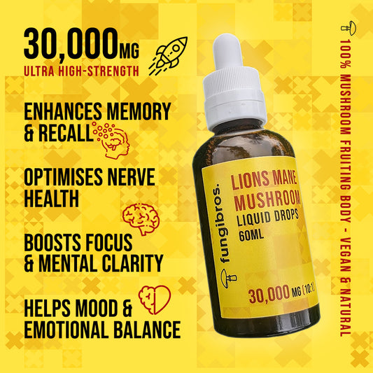 FungiBros. Lion’s Mane Drops are formulated to support brain health, enhance focus, improve memory, and boost the immune system. They are perfect for those seeking cognitive and mental clarity in their daily routine.